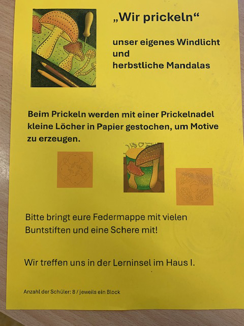 Während in einem Projekt die Prickelnadeln eingesetzt wurden, bauten andere Kinder fleißig Spinnennetze, bastelten Pustemonster oder stellten herbstliche Lesezeichen her. Nicht fehlen durften natürlich die Gestaltung von Windlichtern und das Schnitzen von Kürbissen. Außerdem gab es für diese Klassenstufen die Möglichkeit zu tanzen oder bei einer Wanderung rund um den Caputher See frische Luft zu tanken.